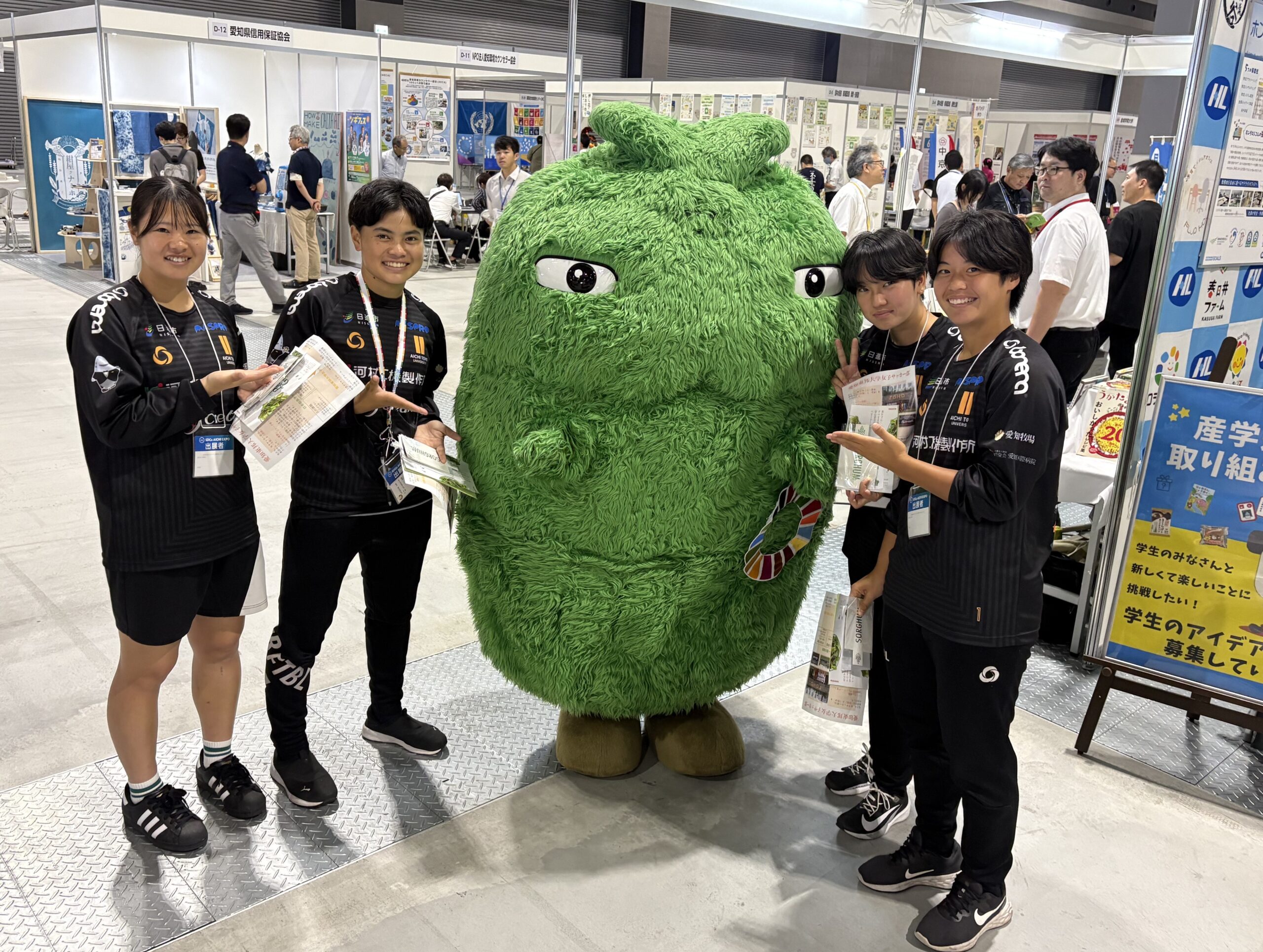 展示ブースでは、今年、部で力を入れたフードドライブの活動を紹介しました。愛知東邦大学のキャンパスや「なつまつり」の会場で家庭などの余分な食糧を集め、それを必要としている家庭や機関に融通する活動で、日進市の協力で行いました。また部員たち自身が考えた「おにぎり」も販売しました。支援企業の一つ豊田鉄工で製造しているバイオ燃料で走る移動用小型車コモビの展示もしました。