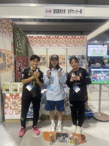 3日は部員2人が「次世代のアスリートが未来を考える」をテーマにしたステージイベントに登壇しました。ともに人間健康学部の都築かんなさん(4年)と下田和さん(3年)が、日本の女子サッカーの課題とそれに対する自分たちの取り組みを発表しました。男子と比べて低い認知度アップのため、地元企業とさまざまな交流を持ったり、練習グラウンドのある日進市で毎年開いている「なつまつり」の様子などを話しました。内容はこちらの動画をご覧ください。さらにスケートボーダーの織田夢海さんとのトークセッションも行いました。