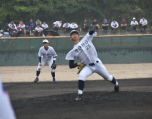 この試合、愛知東邦大学は所属する4年生投手8人が全員で繋ぐリレー登板。前週に完投勝利を飾った堀川悠吏(人間健康学部4年)も1イニングをきっちり抑えました。打線も4年生の野手6人全員が出場しました。前キャプテンの柳瀬太陽(人間健康学部4年)がレフト席に2ランホームランを放つなど、4年生全員で勝利をつかみ取りました。
