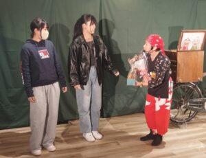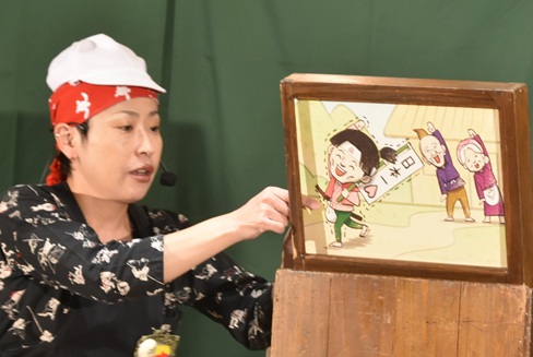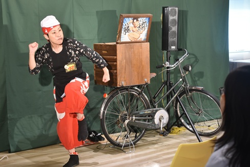 まずはエクササイズで観客の体と気持ちをほぐして、紙芝居の「はじまりはじまり」――全国街頭紙芝居大会で大賞を受賞したこともあるりさちゃんは、桃太郎のパロディー「腿太郎」と、歯を磨こうというコンセプトの「はみがっこー」など2本を熱演。テンポのいい話にくるくる変わる表情、側転やタップダンスなど全身を使ってのパフォーマンスに、食事中の学生たちも笑いの渦に巻き込まれていました。