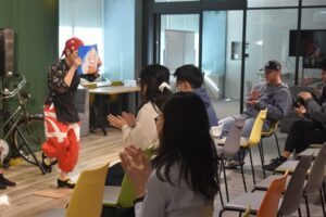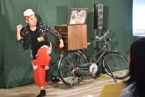 拍子木を打ち鳴らし「紙芝居が始まるよー」という呼び込みが昼休みのS棟に響きました。スチューデントコモンズには、昔懐かしい紙芝居の箱を荷台に載せた自転車と、「りさちゃん」こと中川理沙さんが学生を待ち受けます。