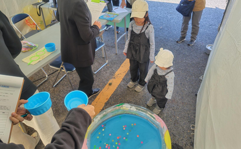 今年は、教育学部の学生2人が中心となり、子どもたちに人気の「スーパーボールすくい」を無料で提供しました。開始直後から列が途切れることはなく、笑顔いっぱいの歓声が会場に響き、学生たちも一緒になって子どもたちの安全に気を配りながら、あたたかな交流を楽しみました。研究室として大切にしている「子どもの笑顔が地域を元気にする」という理念を、まさにその場で体感できるひとときとなりました。