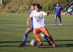 前半は守備を徹底し、連動したプレッシングからボール奪取に成功、相手陣内でプレーする時間が長く続きました。前半33分には、中央の細かい崩しから倉橋陽菜(人間健康学部2年)が冷静にダイレクトで流し込み、先制点を挙げます。