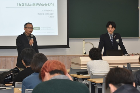 まず棚田支店長は「銀行に行ったことがある人」と尋ねましたが、手を上げた人はいませんでした。キャッシュレス時代でもあり、今の学生は銀行には用がないのかもしれません。続いて銀行の3大業務(預ける、借りる、送金する)について説明がありました。学生にとってこれから社会に出て一番多く関わっていくのは「借りる」で、住宅や車などを買う際の融資融資について棚田支店長の話は続きました。