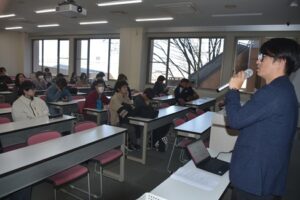 経営学部・原京二教授の1年生の授業「プロジェクト基礎」が121日行われ、東邦学園大学1期生の溜島康貴さんが講師を務めました。
