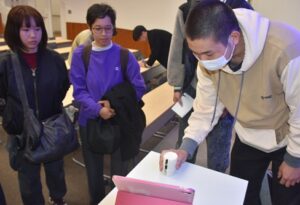 講義の最後に、数名の学生がiWakkaの使い方やゲームを体験しました。「力の調整が難しかった」「豆腐のように柔らかい感覚だった」「筋力と調整力がそろって初めて“手をうまく使える”ことが分かり、調整力の重要性を実感した」と言った感想のほか、「ゲーム要素を加えることで、調整力のトレーニングは日常生活やスポーツにも活用できると感じた」など、iWakkaの可能性に関するコメントがありました。