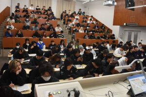 名古屋工業大学の森田良文教授(電気・機械工学類)を招いた人間健康学部1年生向けの「健康実践演習」特別講座が12月3日開かれました。森田教授は、ロボット研究を通じて鵜飼裕之学長と共同研究を行う研究者の一人で、自身が開発したデバイス「iWakka(アイワッカ)」を用いた健康データの活用法などについて講演しました。講座は1年生が全員履修する科目で、約140人が出席しました。