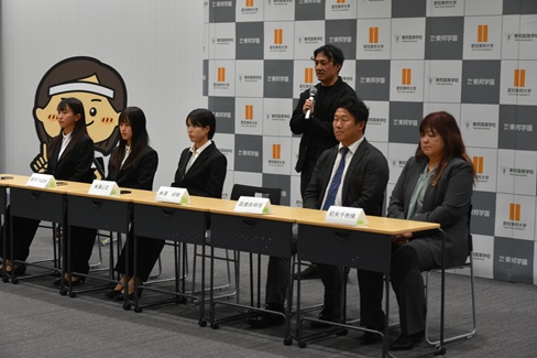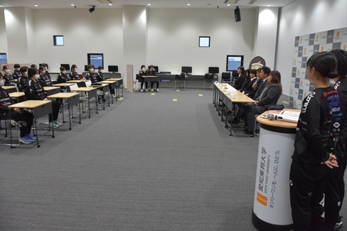 発表の席にはチームメイトや両クラブの関係者、大学関係者らが出席しました。最初にクラブ側の伊賀FCの取締役、初矢千秋さんが「来年は創部50年。節目の年での優勝を目指している中で、米澤さんには1人の選手として期待しています」と挨拶しました。また岡山湯郷の高橋寿輝ゼネラルマネージャーは「昨年入団した彼女らの大学の先輩を見て、この大学の選手ならクラブに貢献してくれるのではないか、と思っています。完成形ではないが、伸びしろがあると思っています」と期待を込めました。