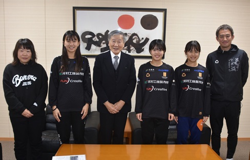 入団発表に先立ち、3人は伊藤数馬女子サッカー部長らとともに榊直樹理事長に入団を報告。榊理事長から激励されました。
