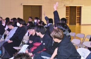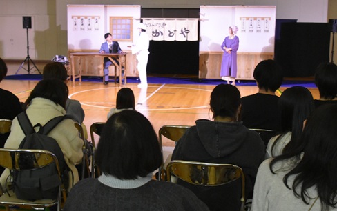 最後に出演した劇団員と学生らとの質疑応答がありました。1つのお芝居が公演できるまでの期間を尋ねた質問には、出来上がってから公演まで40日ぐらいかかるという答えでした。また教員にも必要な声の大きさについて、「声が小さいのだけど、劇のように大きな声を出すにはどうしたらいいか」との質問には「目的があるかどうか、伝えたいという目的があれば、声は出ると思います」と劇団員は答えていました。