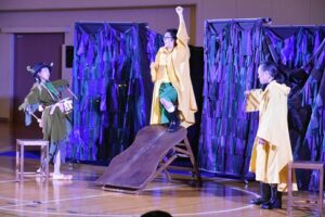 今年は新作「カドヤ食堂のなぞなぞ」を観劇しました。主人公の少年はなぞなぞが大好きで大得意。食堂でうな丼を注文すると「なぞなぞに正解しないと食べられない」と言われ、裏口から田んぼに連れてこられます。そこにいた田ウナギを捕るために「田んぼの番人」となぞなぞ対決をすることに……というあらすじ。歌ったり踊ったり、観客になぞなぞを出題し答えさせるなど、客席を巻き込んで劇は進みました。