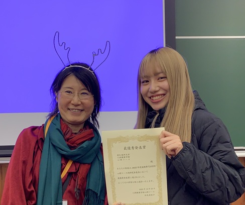 審査の結果、松田ゼミの鈴木茜音さんの「顔写真加工が知覚に与える影響に関する研究の追試」が最優秀発表賞を受賞しました。SNSでアップロードする写真の加工について、SNSに慣れている人と慣れてない人とでは感じ方が違うのではないかという疑問に対し、精緻な実験デザインによってデータを取得した結果、仮説が支持されたことを明快に説明した点が受賞理由です。中間構想発表会に引き続いての最優秀賞です。