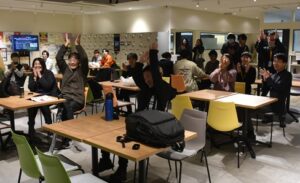インカレに出場した女子サッカー部を応援するパブリックビューイングが12月25日、スチューデントコモンズ(SC)で開かれ、集まった約30人が勝利と初のベスト8に歓声を上げました。