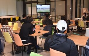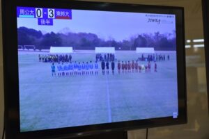 SCに置かれたテレビモニターからは、全日本大学女子サッカー連盟公式ユーチューブの愛知東邦大学と周南公立大学(中国第2代表・山口)の試合映像がリアルタイムで流れるようになっていました。モニターからは「We are TOHO」「オーレ、オーレ」など会場で声援を続ける女子サッカー部員たちの元気の良い声が流れてきます。