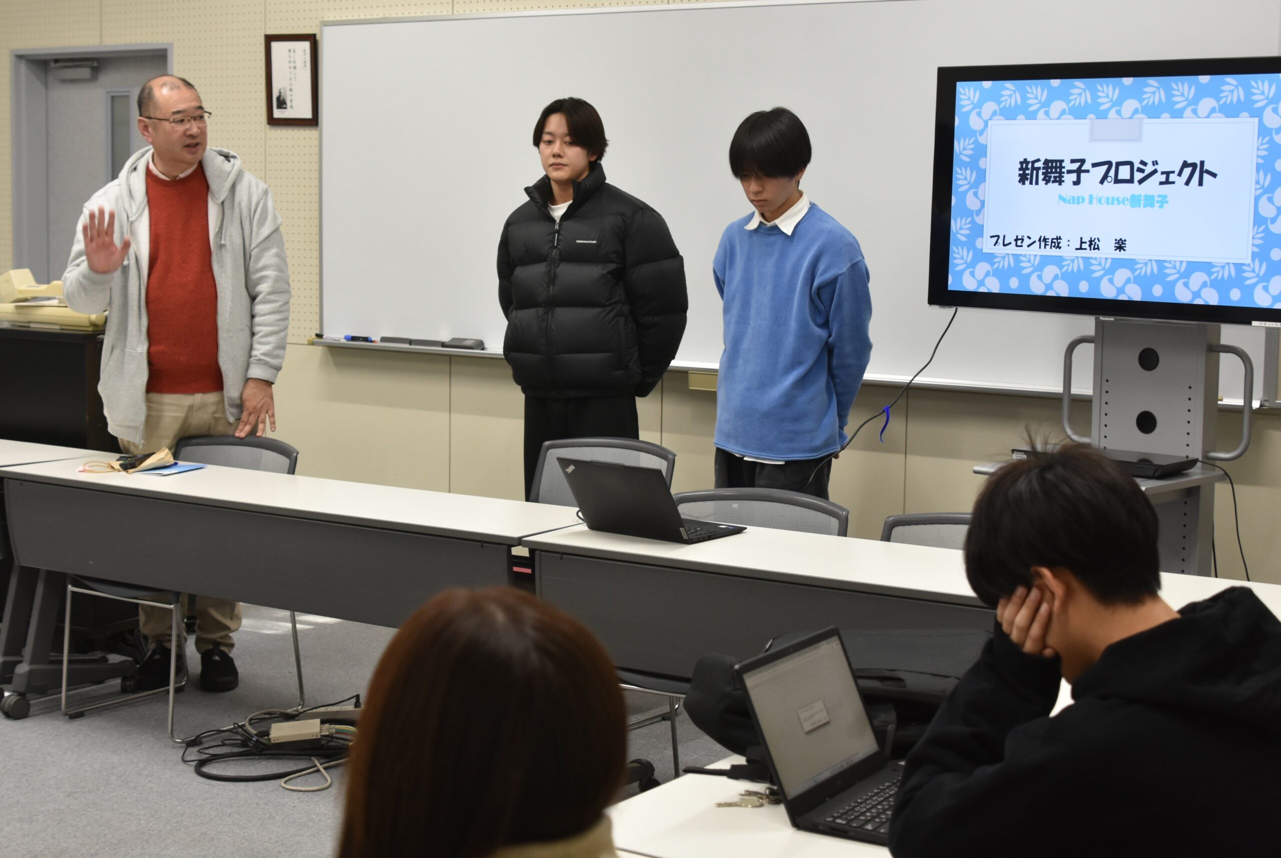 体の冬フェスを開く――の4つの提案がありました。それぞれの発表の後に、他のグループの学生や「日誠」の担当者から質問があり、すらすら答えるグループがある一方、答えに窮する学生もいるなど本番さながらのやり取りもありました。最後に「日誠」の審査で、ナップハウスを提案したグループに大賞(優秀賞)が贈られました。