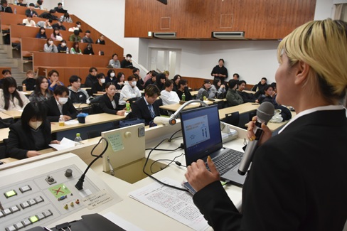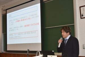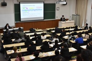 学生たちは、高齢者のスマホ利用やペット問題、幼児のお昼寝、カードゲーマーなど関心を持った身近な問題から、学生時代の部活体験を元にした研究・分析などさまざまな問題に取り組んでいました。1人6分ずつ研究成果を発表し、会場からの質疑応答に答えました。先生方からも質問があり、研究者の先輩らしく学生たちが見逃しがちだった点などへの、厳しいながらも愛情あふれる指摘が数多くありました。