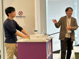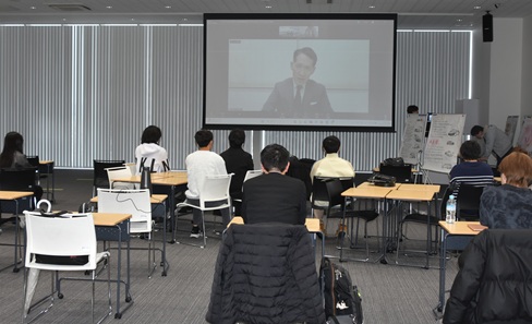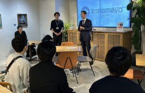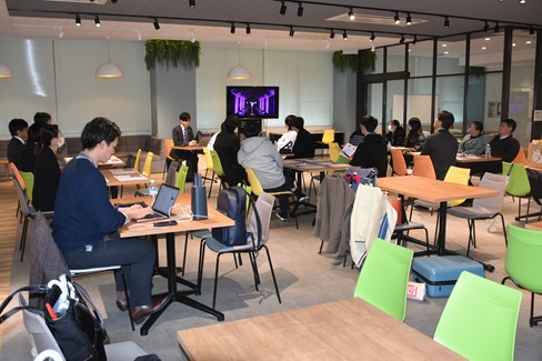 その後、それぞれの大学の学部も違う学生らが、それぞれの地域連携活動に関する事例報告などをしました。前日の24日も、名古屋市昭和区のオープンイノベーション拠点「STATION Ai(ステーション エーアイ)」で、「株式会社musbun」によるレクチャー・施設見学を兼ねて事例報告が行われました。報告者の山本虎徹さん(経営学部3年)は「学外の施設で、初めて会うみなさんが相手でしたが、谷口正博先生とのプロジェクト活動を、自信を持って発表することができました」と笑顔を見せていました。