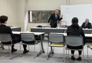 午後は面接と場面指導の練習でした。名古屋市で小学校の教諭や校長を歴任され、採用試験の面接官を務めた経験もある久野賢二さんの指導を受けました。回答の内容だけでなく、姿勢や話し方が与える印象についても模擬面接を繰り返しながら丁寧に指導していただきました。