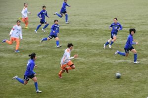 雨交じりの強い風の吹く中、開始1分、後方からのボールを受けた伊藤凜莉(人間健康学部4年)がトラップしてシュートを放ち、ゴールネットを揺らしました。最悪のコンディションの中で、幸先の良いスタートを切ることができました。前半はボールを支配し、相手にシュートを1本も打たれることなく、ほぼ相手コートでプレーしました。前半のうちに3点を取り主導権を握りました。