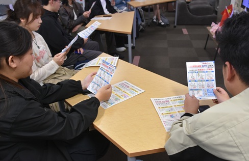 また国際交流課のスタッフから、自転車に乗っている時に呼び止められ「違反です」と言われ「反則金」の支払いを求められた場合、その対応について留学生に質問が出されました。「支払う」という答えに対して、警察官は「警察官は現場でお金の支払いを求めることは絶対にありません。払えと言われたら詐欺です」と答えていました。実際にこういう詐欺被害が出ているそうで、注意を喚起していました。
