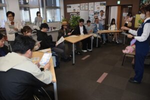 まず国際交流課のスタッフから、一般的な生活に関する注意がありました。自宅(アパート)のハザードマップの確認や、年金の支払い猶予制度の注意事項、さらには新入生向けに日本語学習の方法などの説明を受けました。