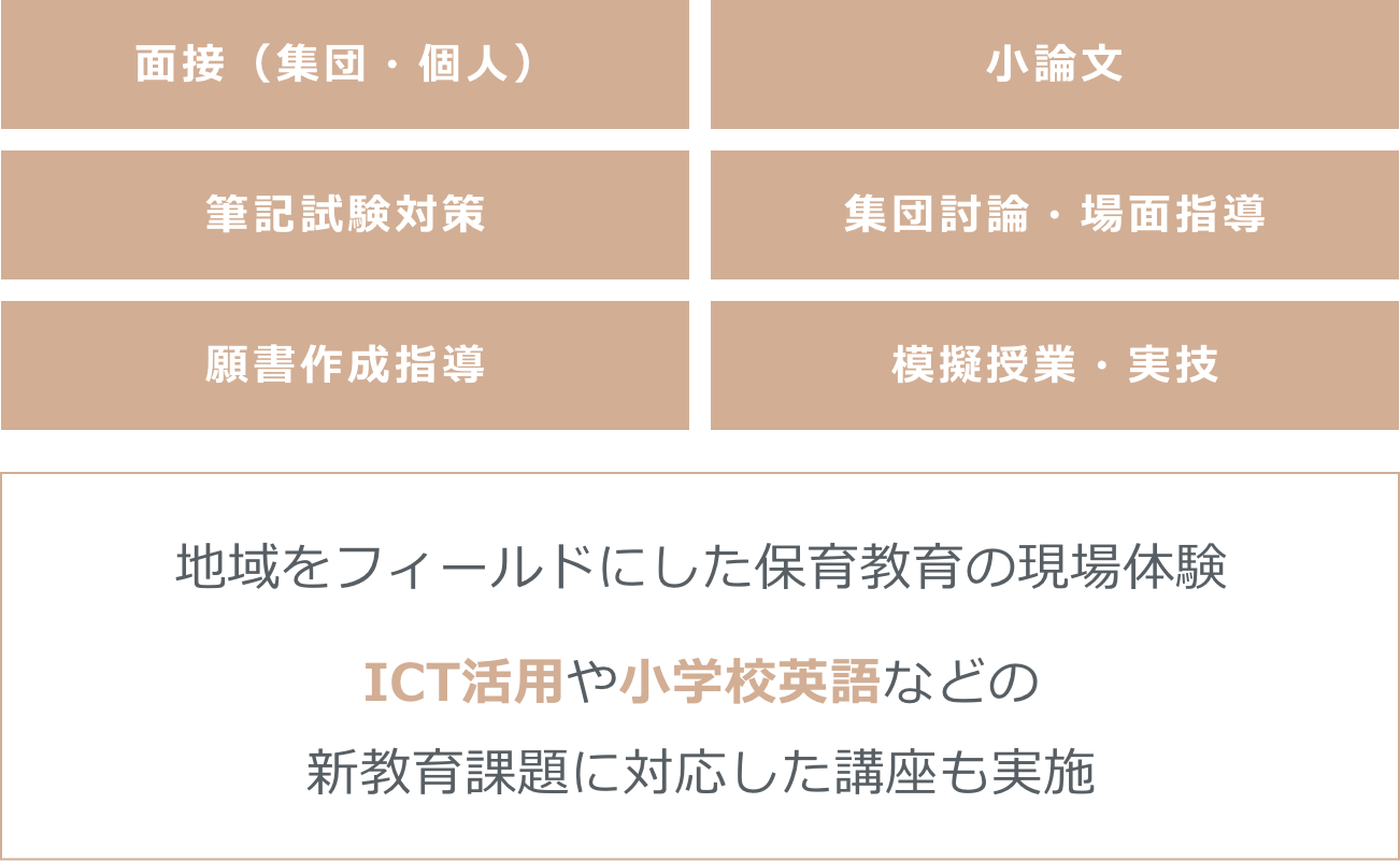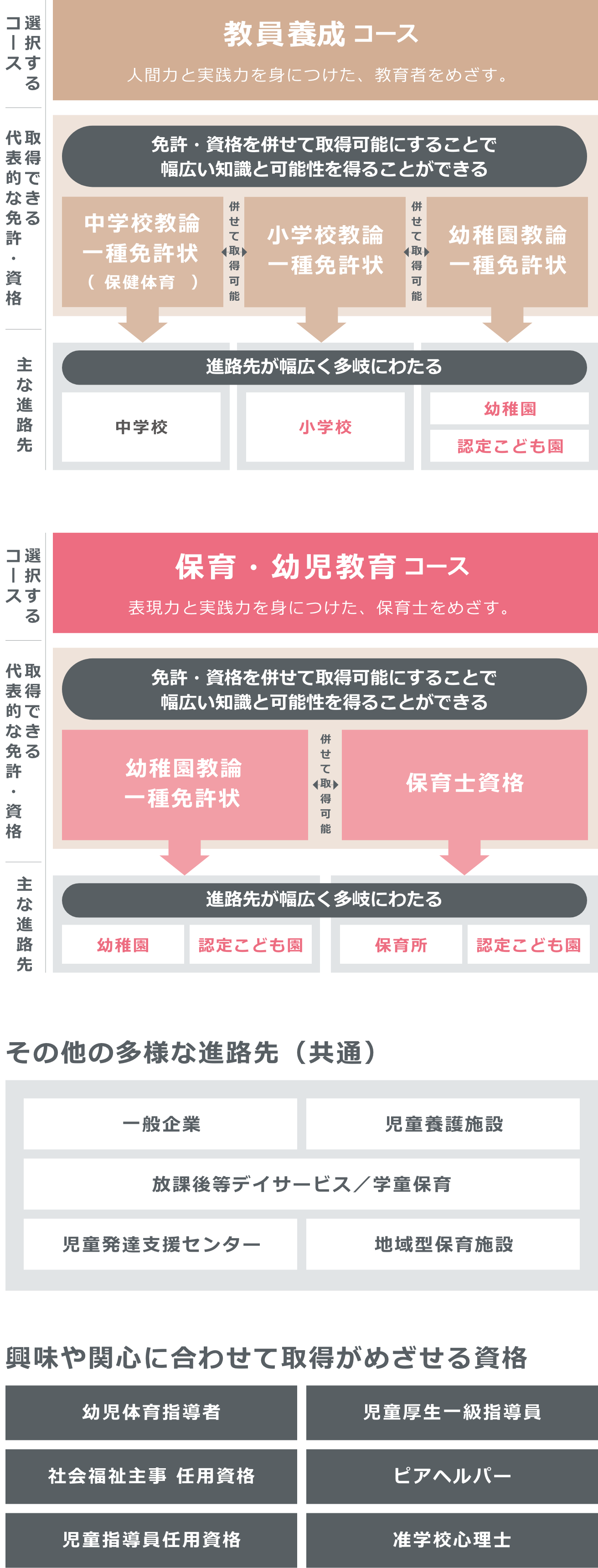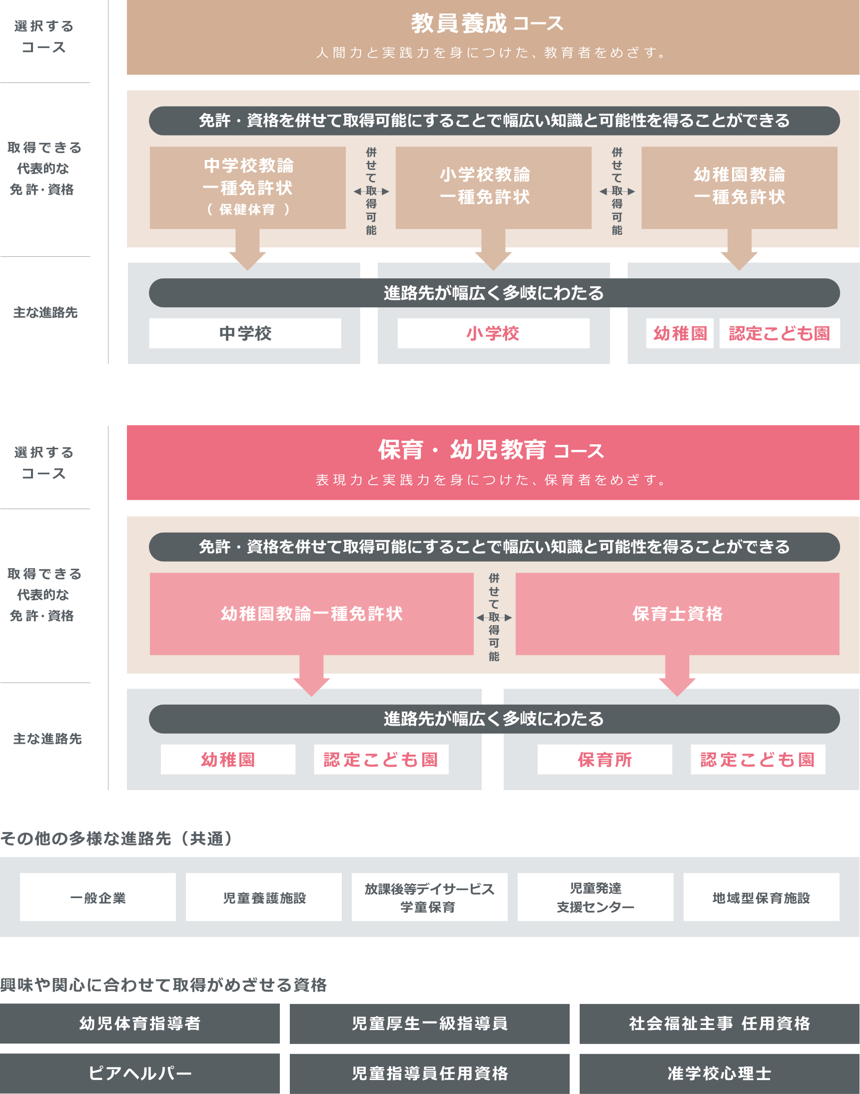 幼児教育コースでは保育士資格や幼稚園教諭一種免許が、初等教育コースでは幼稚園教諭一種免許や小学校教諭一種免許などの資格が取得でき、保育や教育に関する様々な場所への就職機会があります。