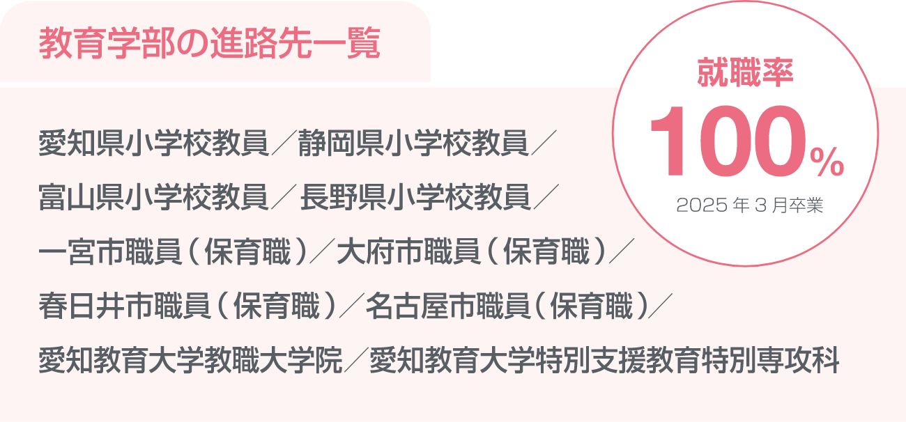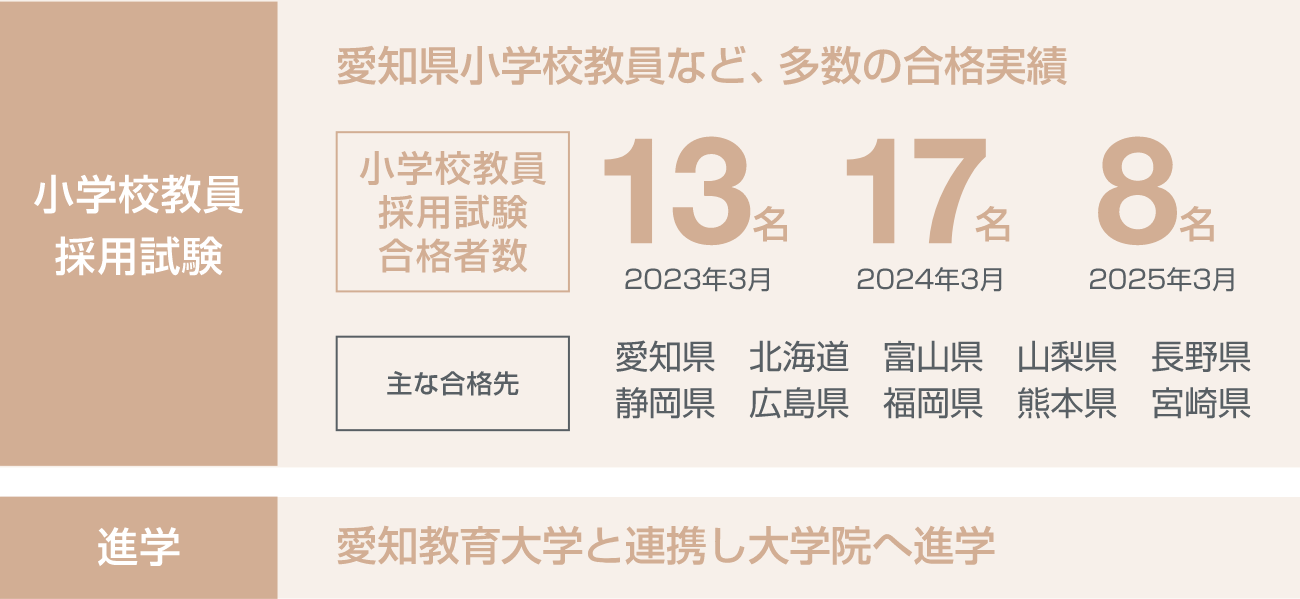 小・中学校教員として働くためには、採用試験対策が必要です。愛知東邦大学では、学生一人ひとりの能力や特性を教員が把握し、希望する進路先や自治体に合わせたきめ細かな合格支援を行っています。