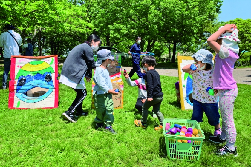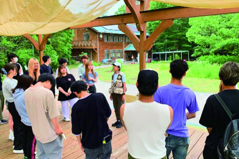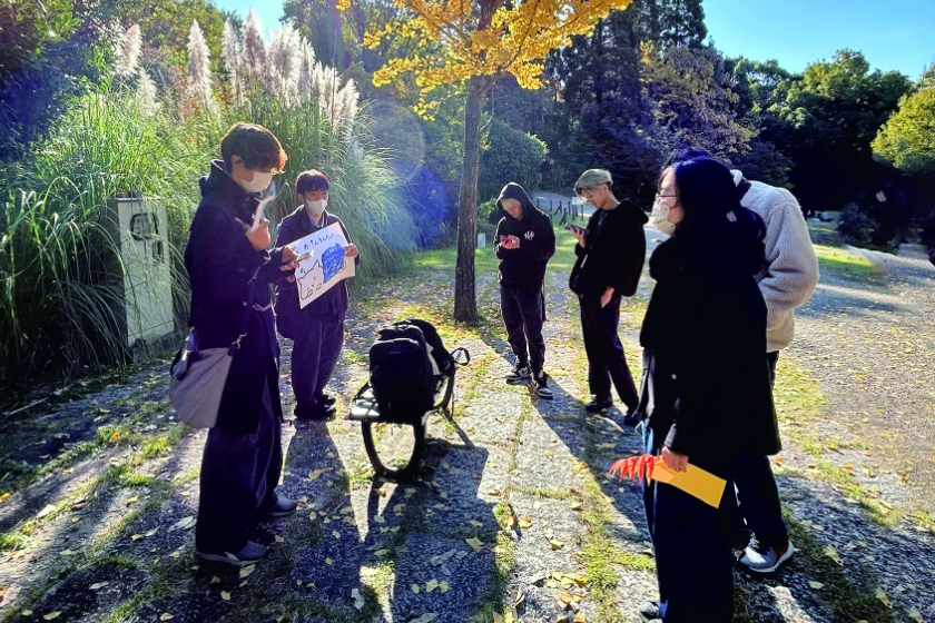 自然のなかで五感を活かした遊びは保育現場でも取り入れられています。大学の隣にある平和公園で「ネイチャー・ゲーム」を体感します。