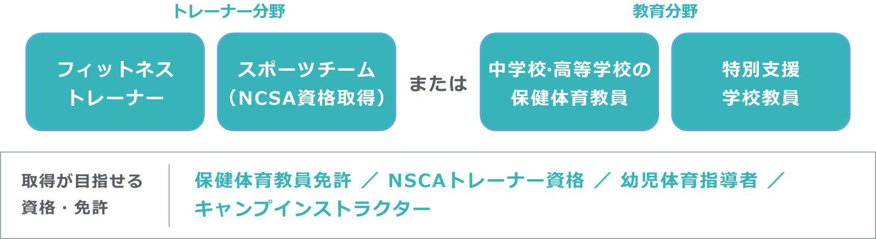 スポーツと健康に関する高度な専門知識と実践的な指導スキルを活かし、教育現場でスポーツや健康の大切さを教えることができるため、小学校教員、特別支援学校教員、中学校及び高等学校の保健体育教員、幼児体育指導者などをめざせます。また、個々のニーズに応じたトレーニングや指導を行うスキルも活かせるため、フィットネストレーナー、スポーツ関連の企業などでプロフェッショナルとして活躍することも可能です。特に、NCSAのトレーナー資格を取得することで、スポーツチームやスポーツジムなどへの就職もめざせます。
