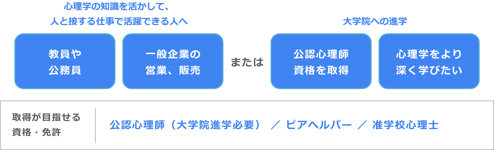 4年間で多様な見方・考え方を学び、就職では、教員や公務員はもちろんのこと、一般企業でも営業や販売など人と接する仕事において心理学の知識を活かして活躍できます。また、スクールカウンセラーなどの専門職になるには公認心理師資格を取得する必要があります。本学の公認心理師カリキュラムを履修し、大学院への進学をめざすことができます。